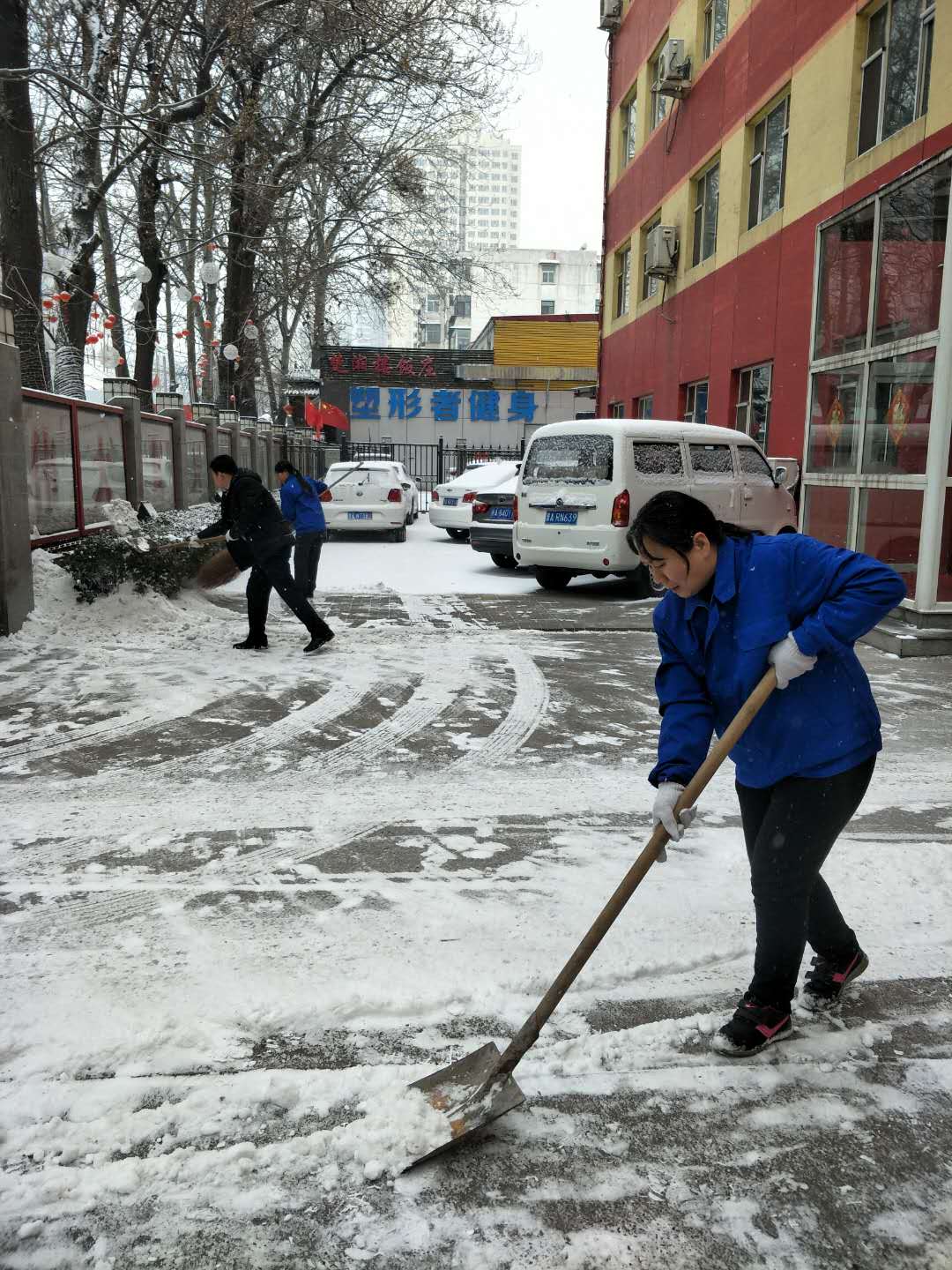 公司管理人員積極組織各項目點員工進行主干道路面清雪(左上圖為晉城職業(yè)技術(shù)學(xué)院、右上圖為太原體彩中心)