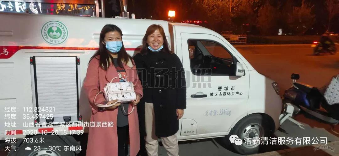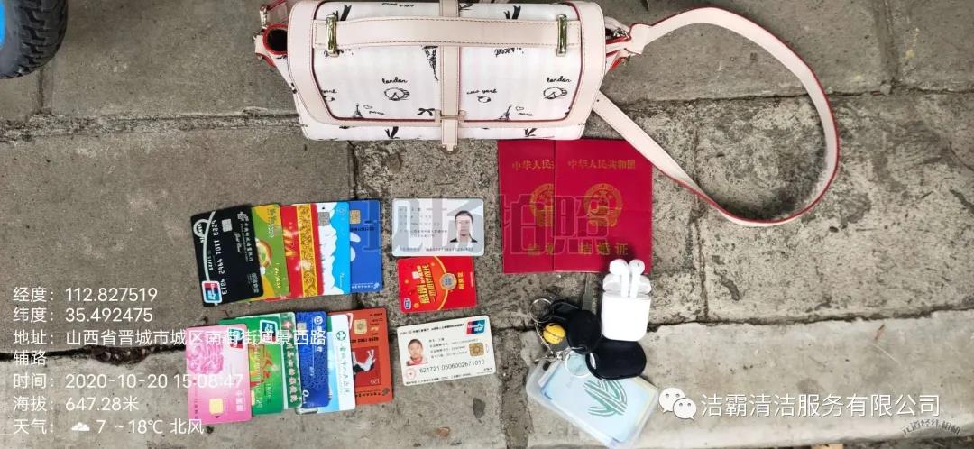 10月20日下午3點(diǎn)左右,晉城市潔霸清潔服務(wù)股份有限公司保潔部環(huán)衛(wèi)經(jīng)理李通和工人在城區(qū)南街街道景西路段進(jìn)行街道清洗作業(yè)時(shí),忽然看見(jiàn)晉城農(nóng)商銀行門(mén)前的綠化帶里有一個(gè)女士挎包,忙叫環(huán)衛(wèi)工人郭志云把挎包撿了起來(lái)。當(dāng)時(shí)就考慮到失主丟失挎包以后一定很著急,在同事的共同見(jiàn)證下他們打開(kāi)挎包,經(jīng)過(guò)查看,發(fā)現(xiàn)挎包內(nèi)有一張王女士的身份證、社?般y行卡數(shù)張,還有結(jié)婚證、鑰匙、耳機(jī)、富士康工牌等物品。憑借富士康工牌上的工號(hào),他們給富士康打電話聯(lián)系到了失主,后由環(huán)衛(wèi)主管秦彩鳳將挎包交到失主手中。收到失而復(fù)得的挎包,王女士又驚又喜,感激萬(wàn)分。