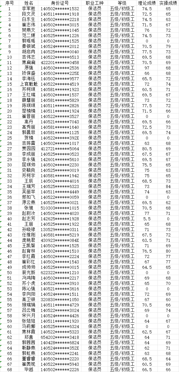 晉城市潔霸清潔服務(wù)股份有限公司職業(yè)技能等級(jí)認(rèn)定中心現(xiàn)將2024年7月7日認(rèn)定人員成績(jī)公示如下: