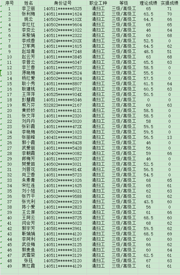 晉城市潔霸清潔服務(wù)股份有限公司職業(yè)技能等級(jí)認(rèn)定中心現(xiàn)將2024年8月3日認(rèn)定人員成績公示如下: