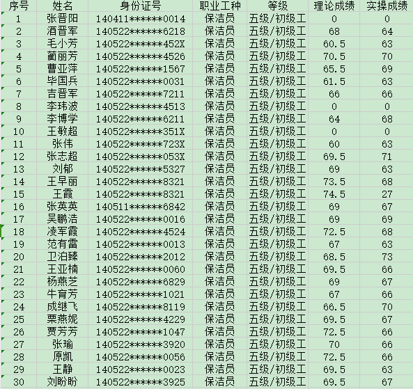 晉城市潔霸清潔服務(wù)股份有限公司職業(yè)技能等級(jí)認(rèn)定中心現(xiàn)將2024年8月31日認(rèn)定人員成績(jī)公示如下: