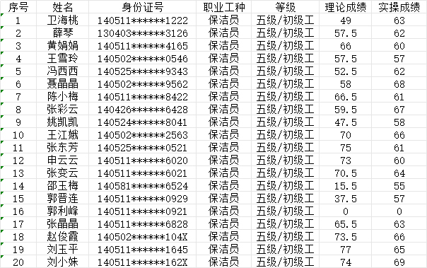 晉城市潔霸清潔服務(wù)股份有限公司職業(yè)技能等級(jí)認(rèn)定中心2024年9月14日第37批保潔員初級(jí)認(rèn)定人員成績(jī)公示