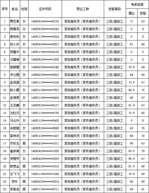山西潔霸清潔服務(wù)集團(tuán)股份有限公司職業(yè)技能等級(jí)認(rèn)定中心2025年8月30日第1批家政服務(wù)員(家務(wù)服務(wù)員)高級(jí)認(rèn)定人員成績(jī)公示