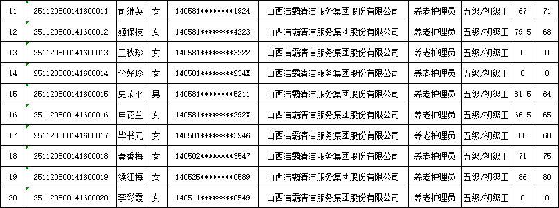 山西潔霸清潔服務(wù)集團(tuán)股份有限公司職業(yè)技能等級認(rèn)定中心2025年11月22日第4批養(yǎng)老護(hù)理員初級認(rèn)定人員成績公示